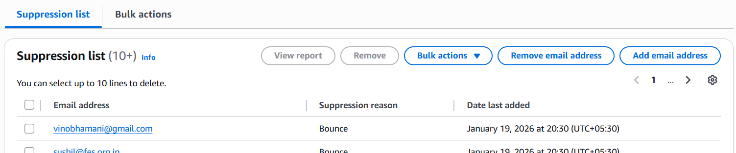 - Suppression reasons: Bounces and Complaints