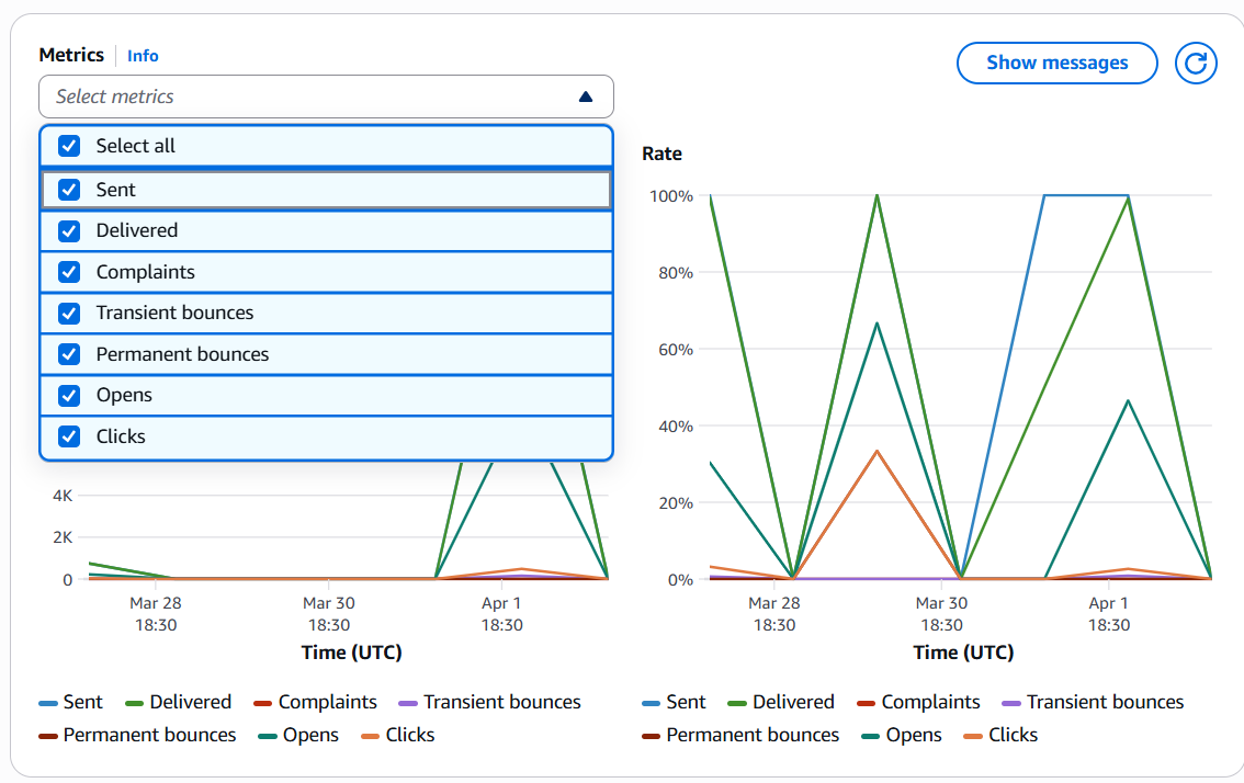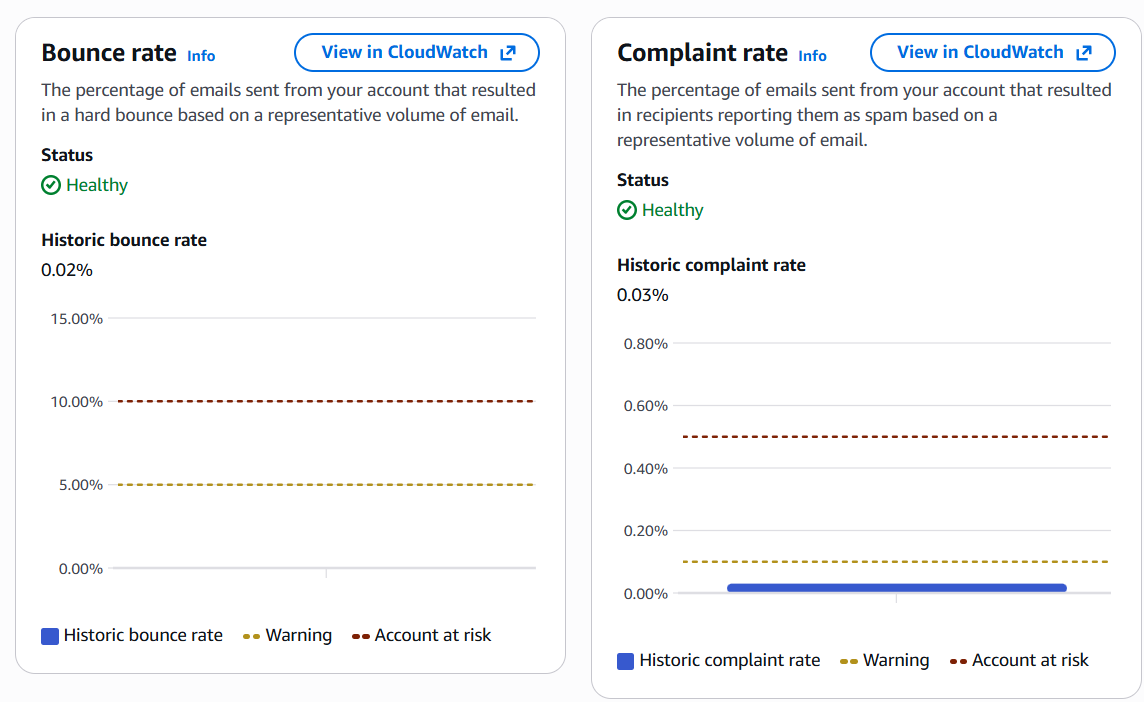 The Reputation metrics page gives you a look into two key metrics that Amazon SES takes into account when evaluating your sender reputation and the health of your account.