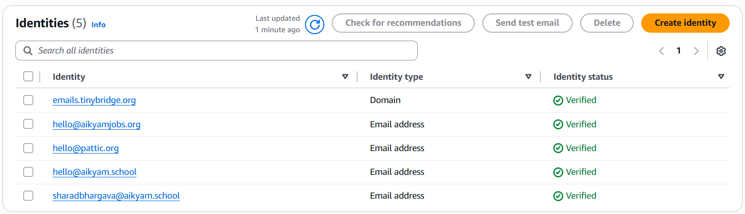 - Only verified identities can send emails. This prevents spam/spoofing